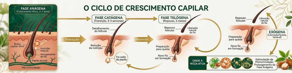Nota de Especialista: "A saúde capilar não se trata de 'colar' o fio no couro cabeludo, mas de garantir que o novo fio que está nascendo na fase anágena tenha força e nutrição suficiente para permanecer no ciclo." — Equipe de P&D Weza Professional.